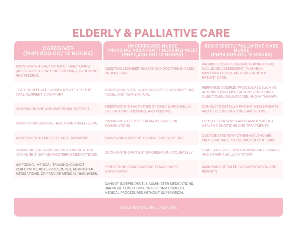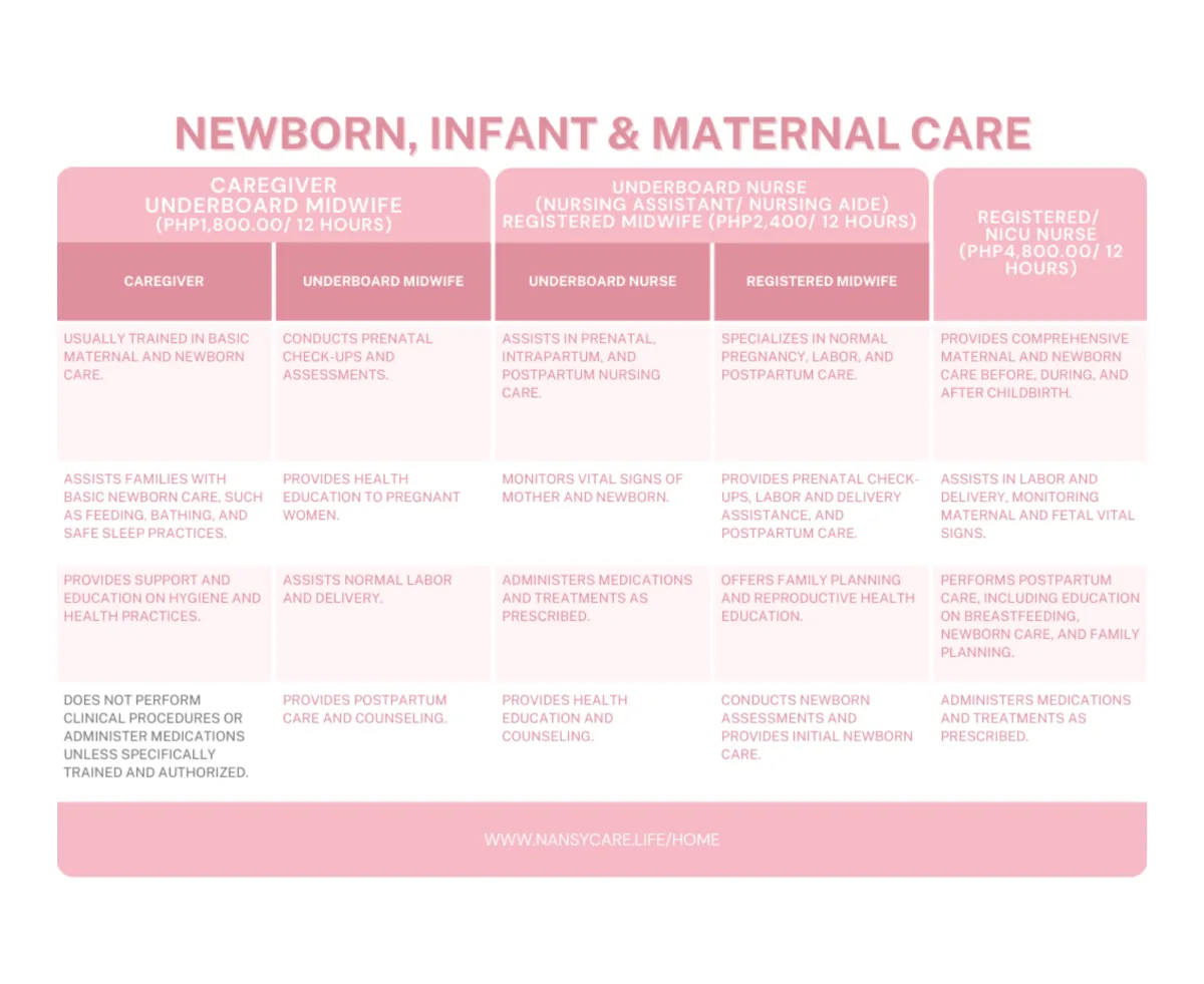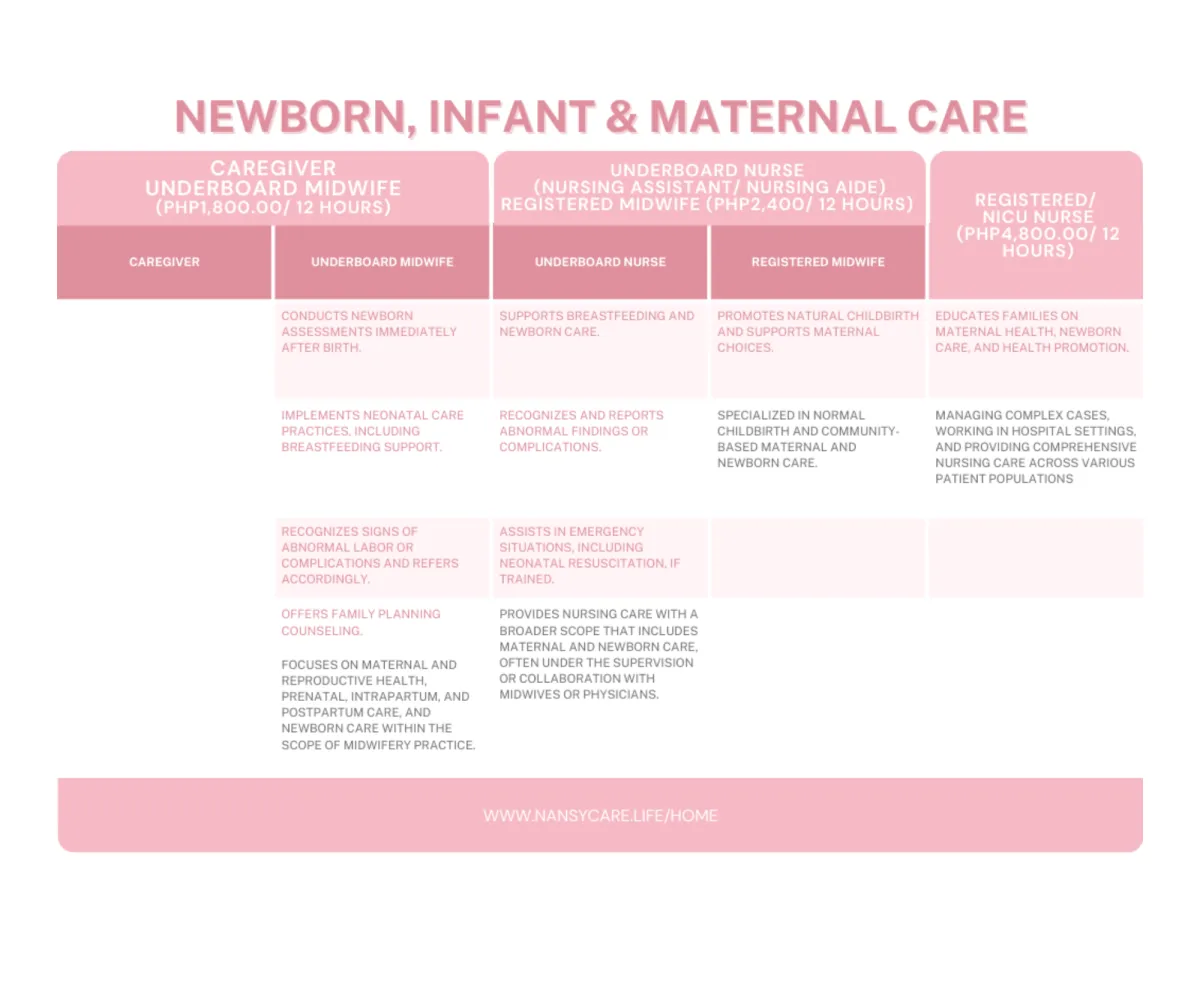 Caregivers (CGs), Under Board Nurses (UBNs), Registered Midwives (RMs), Registered Nurses (RNs)