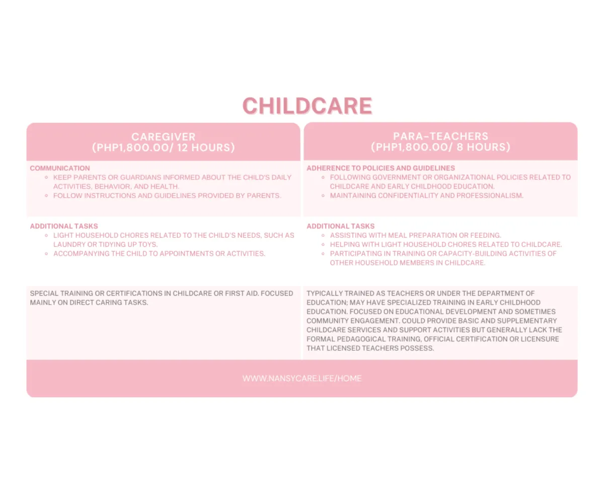 Special training or certifications in childcare or first aid. Focused mainly on direct caring tasks.